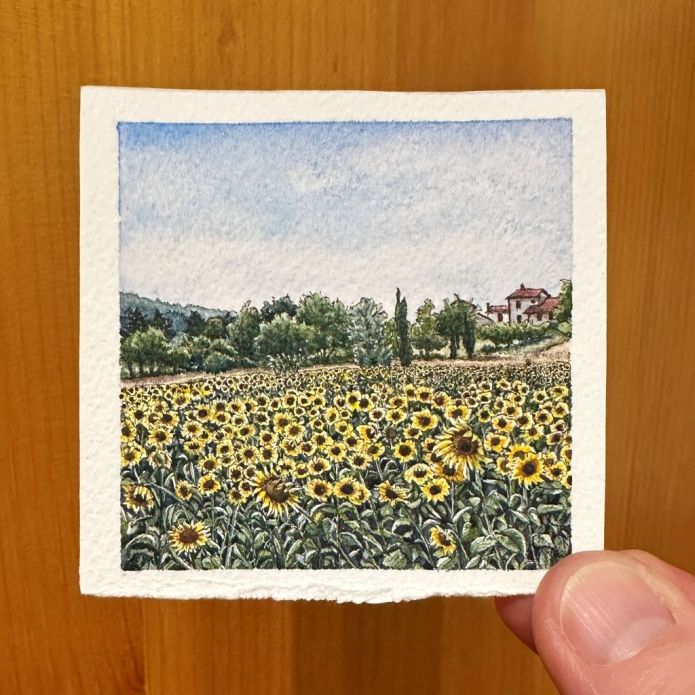 It’s quite a testament to this plant that it can bring so much joy to people. I’ve seen visitors to my art shows break into broad smiles upon seeing a sunflower-themed painting. My latest miniature of a Tuscan field was the first painting to sell at this summer’s Toronto Outdoor Art Fair. And then afterward, I was asked by other visitors if I had any more sunflower pieces available! They were definitely in demand… more than usual.
