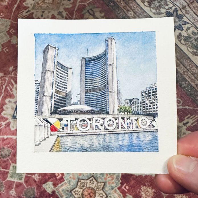 And when Toronto’s City Hall buildings were built in 1965, they were a revelation and also very controversial. Supposedly at the time, you loved them or you hated them. I’ve always thought they looked like a futuristic hug! Along with the Toronto sign and the reflecting pool, it’s now Selfie-Central and much beloved. This was the first time I painted them – using one of the photos from a past art fair in the Nathan Phillips Square. The square is filled with more positive energy than usual during this event, so a perfect subject to paint!