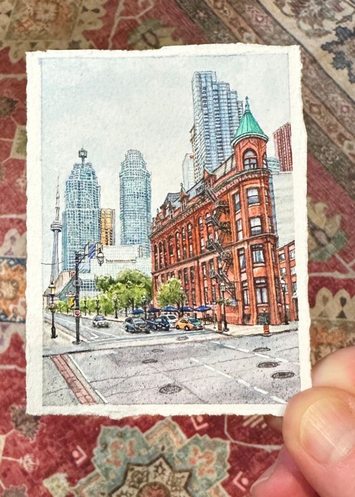I’ve painted the Gooderham Building (affectionately called the Flat Iron) numerous times, especially from this perspective because the CN Tower manages to sneak into view around the high-rise towers. It’s “quintessentially Toronto” as a visitor to one of my shows commented.