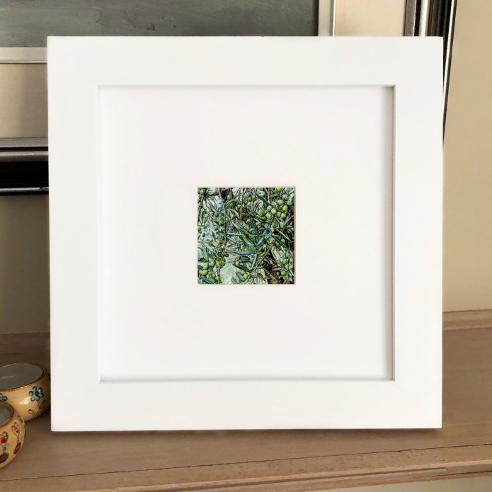 My third reason for choosing olive trees to paint is an art-centric one. These subjects present a challenge, mostly in attempting to establish the many layers of branches in the foreground and different backgrounds. Unlike some pieces, these paintings require some planning to establish some balance – deciding which branches and fruit will go where! Being a “puzzle girl”, I like these composition challenges.