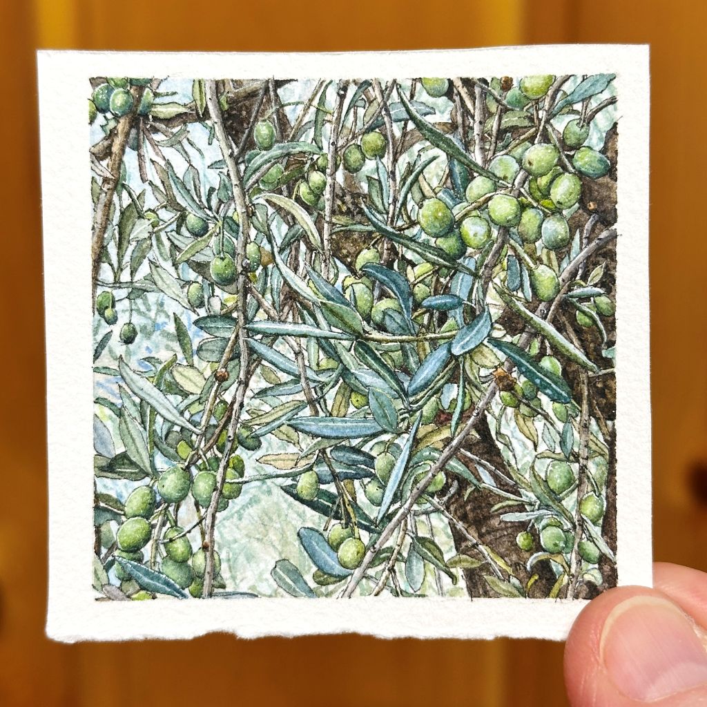 Perhaps there are obvious answers having to do with memories of Italian holidays or a love of their beautiful oil. My reasons are three-fold. Firstly, I have those fond memories of taking my first walk through an Italian olive grove in fascination (see here for my first olive story). Secondly, I stayed in an apartment that backed onto an extensive grove, and from my back terrace, my soundtrack was the wind blowing through the fluttering slender leaves. Talk about a calming influence! Now when I look at photos or my paintings of olive trees, I “hear” them!