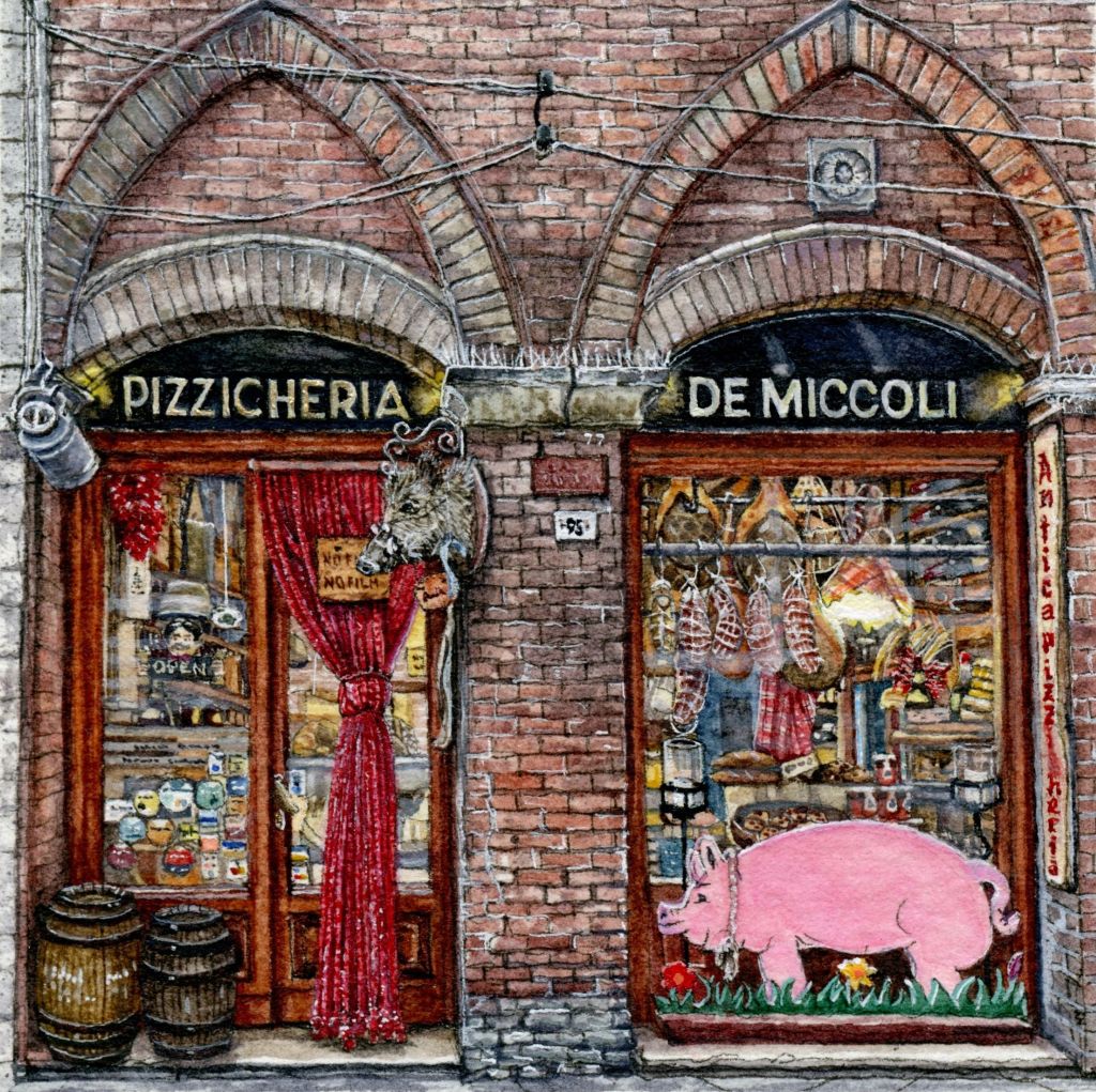 In my first year as an artist, a couple commissioned me to paint this shop from one of their photos (see it here). I really enjoyed the experience of painting all the delicious details in the window. However, at that time, I had not been to this shop on any of my Siena visits – how had I missed it?! So on subsequent visits to Siena, I made sure to experience it for myself. This new painting is from one of my photos, and as I painted this little treasure, my mouth was constantly watering from memories of their porchetta panino!