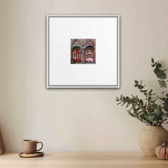 This new miniature is of one of those fascinating shopping spots – De Miccoli in Siena, Italy. It’s a famous delicatessen-type store, where you can get all kinds of delicious Tuscan traditional foods, and many local meats and cheese. Once you’ve selected your groceries, you can takeaway a panino sandwich to fuel you for the walk home. And with the wooden cutout cinta sinese pig out front, you can guess their specialty sandwiches!