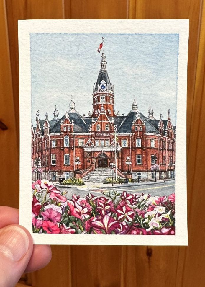 The second painting of Stratford is of our historical City Hall from a photo I took during the summer. The “breathing room” this painting delivered was two-fold. Firstly, the cheery warm colours and foreground flowers in the scene contrasted the extremely harsh winter weather outside my studio window as I painted. It provided hope that summer will eventually be back! And secondly, the beauty and complexity of this 1900 Victorian building provided me with more awe-filled discovery as I painted it – odd angles and ornate decorative features. The City Hall building truly rivals the beauty of the flowers in the scene, and I came to see how compositionally they belong so well together.